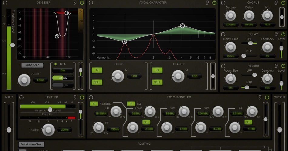 Key features include Vocal Character, a unique 2-band vocal EQ that follows the pitch of vocal notes. The 32c Channel EQ offers a 4-band design with high and low filters, modeled directly after the Harrison 32c console’s channel EQ.