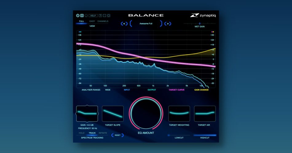Balance is an adaptive balancing equalizer that makes global EQ curve shaping quick and easy. It functions as a 16-channel capable smart equalizer, adaptively controlling the overall frequency distribution of audio to match a target EQ curve set with just a few controls.