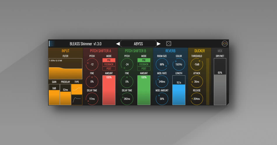 Experience a unique pitch-shifting reverb that emphasizes harmonics and adds a smooth and pleasing reverb tail to any sound! The clean and flexible UI and pro-quality Shimmer of BLEASS Shimmer make it a studio-quality effect with very low CPU usage.