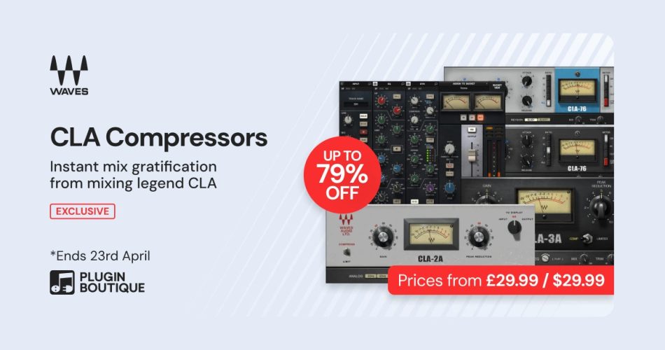Plugin Boutique’s exclusive “Band Month” sale offers up to 79% off on Waves Audio’s CLA Compressors series. These compressor models, created in collaboration with mix engineer Chris Lord-Alge, are available at reduced prices until April 23rd, 2026.