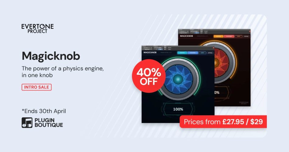 Plugin Boutique is running an introductory sale on Evertone’s one-knob plugin series. Magicknob and Magicknob Red are now $29 USD each, down from $49 USD, until April 30th, 2026. The bundle of both plugins costs $45 USD during this period, while other Evertone products are 40% off their regular prices.