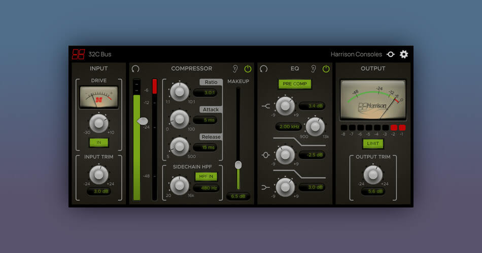 The 32C Bus plugin combines four key Harrison processing modules into one bus processing tool. These include the Mixbus32C Tape Saturation / Drive processor, a Bus Compressor with Harrison’s renowned 32C Hi-Pass filter, the Mixbus32C three-band Bus EQ, and the Mixbus32C Master Strip Limiter.