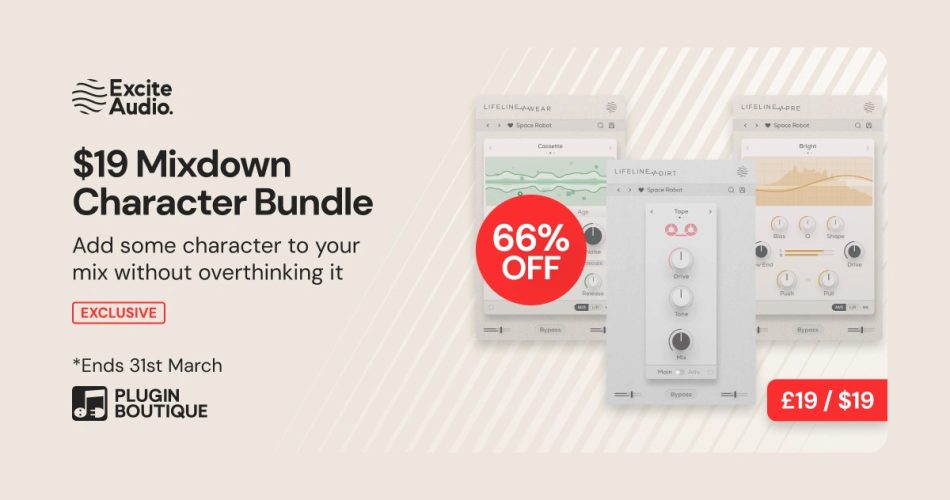Plugin Boutique is offering the Excite Audio Mixdown Character Bundle at a 66% discount for $19 USD until March 31st, 2026. This limited-time deal features three creative processors: Lifeline Wear, Dirt, and Pre. You can find it here: Mixdown Character Bundle.