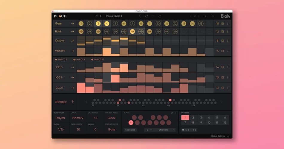 PEACH generates arpeggiated patterns by allowing each lane to operate at its own step length. This creates evolving, polymetric sequences with groove and variation, unlike traditional arpeggiators limited to fixed up/down cycles.
