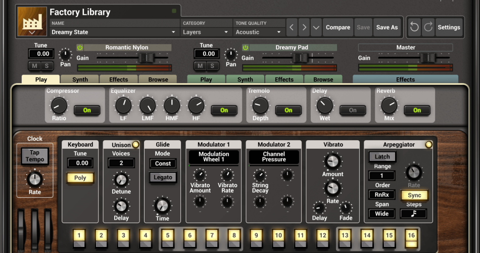 String Studio VS-3 is a multitimbral synthesizer that uses unique string oscillators instead of traditional VCOs, DCOs, or operators as its primary sound source. These oscillators model interactions between picks, bows, and hammers with a virtual string, creating a mix of modern and creative synthesis tones. The plugin includes a soundboard, classic filters, an envelope generator, a LFO, and studio-quality effects for further sound shaping.