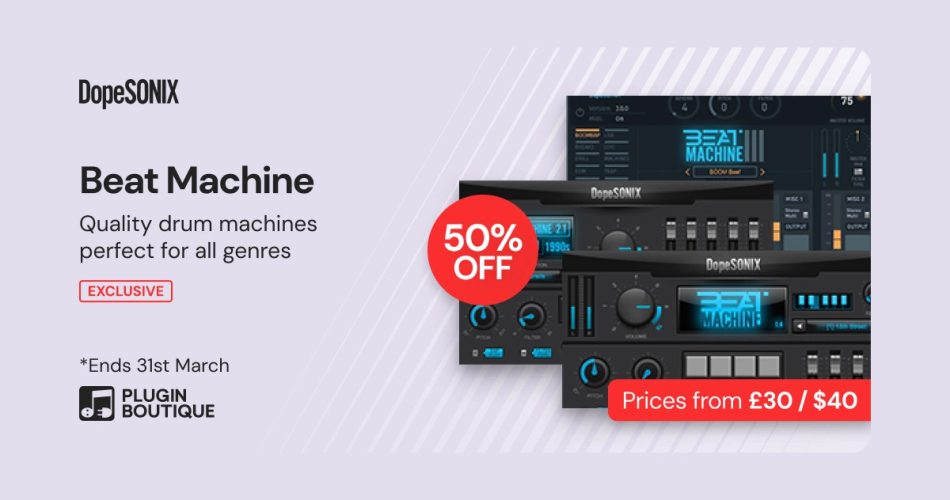 Plugin Boutique is offering an exclusive 50% discount on the Beat Machine series of virtual instruments by DopeSONIX. This promotion ends on March 31st, 2026.