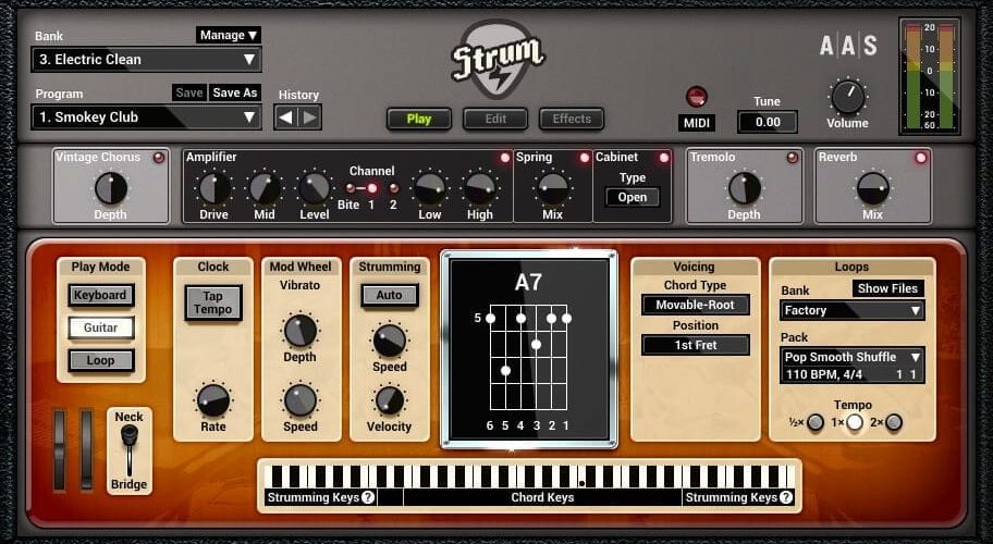 Strum GS-2 is a plugin designed for producing realistic guitar tracks. It features a large collection of acoustic and electric guitars, along with automatic chord recognition, sophisticated chord voicing, integrated strumming and picking actions, a MIDI riff library, and built-in amp and effects options.