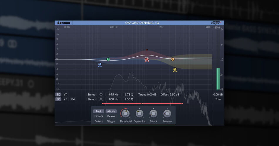 The Dynamic EQ provides unique features such as onset detection, which is especially useful when working with drums and percussion, and mid-side processing that enhances vocals without affecting the side-channel balance or opens up mixes by focusing low-end energy in the centre.