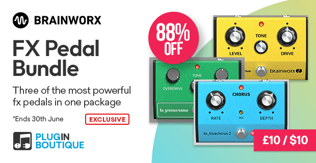 Plugin Boutique offers an 88% discount on Brainworx’s classic blue chorus, screaming tube distortion, and yellow overdrive pedal collection in an exclusive promotion of the FX Pedal Bundle.