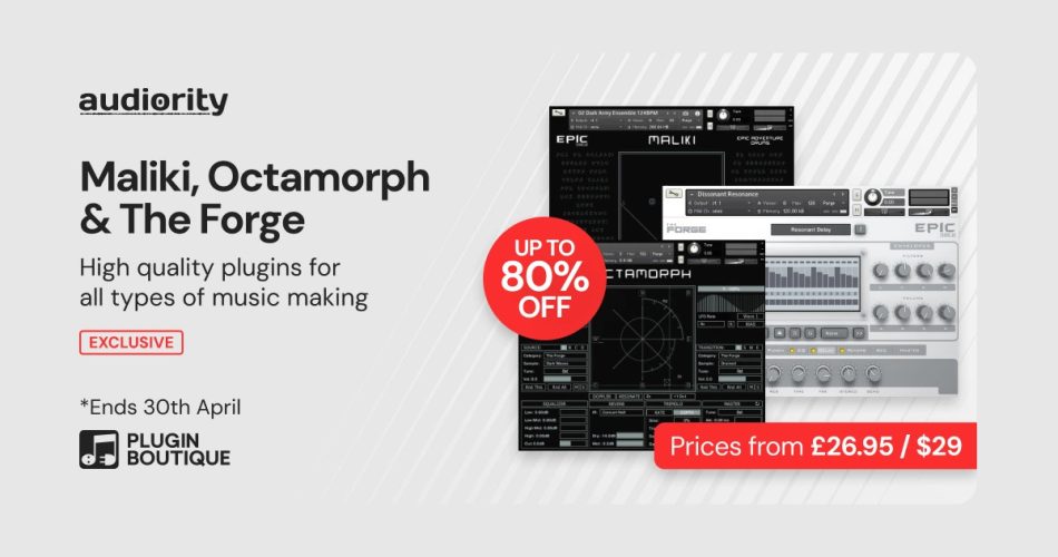 Plugin Boutique is running a sale on Audiority’s cinematic Kontakt instrument libraries, with discounts up to 80% off. Prices start from $29 USD. The promotion ends on April 30th, 2026.