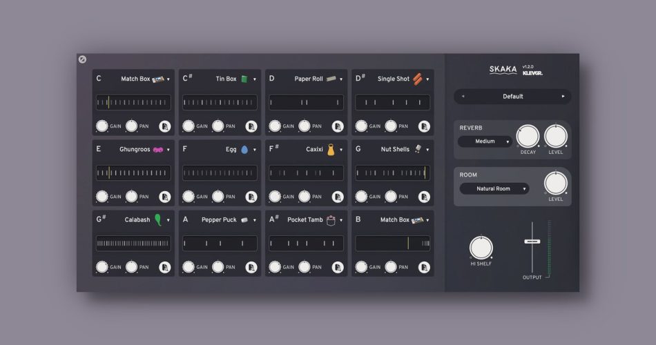 Additional effects include a reverb, room simulator, and high-shelf filter. Producers incorporating shaker percussion into tracks would use this plugin for authentic rhythms in genres like pop, electronic, or acoustic music.
