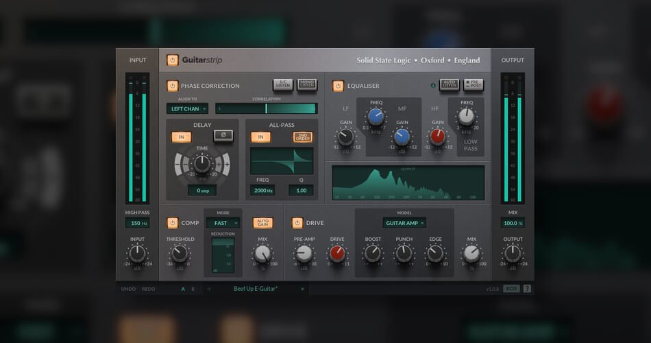 The SSL Guitarstrip is a processor designed for electric, acoustic, and bass guitars. It includes four tailored modules for shaping tones during pre-mix and mixing stages.