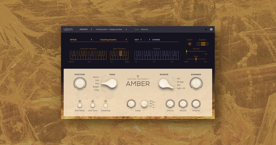 Virtual Guitarist AMBER is an ideal music companion when you need bright and warm acoustic guitar strums. This versatile instrument is pre-loaded with more than 50 styles, over 600 phrases, and several effects and sound shaping controls. UJAM has meticulously captured the sound of a boutique American vintage dreadnought and a legendary German vintage large diaphragm microphone, providing an exceptional sonic experience. The guitar pickup has also been used to increase sonic versatility.