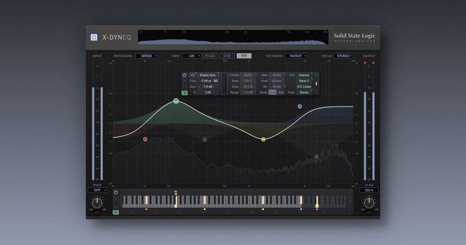 X-DynEQ serves as a tool for dynamic equalization in recording, mixing, and mastering stages. It extends the capabilities of the X-EQ 2 plugin by allowing EQ parameters to adjust based on the input signal’s dynamics, drawing from Solid State Logic’s decades of EQ design experience in analogue and digital consoles.